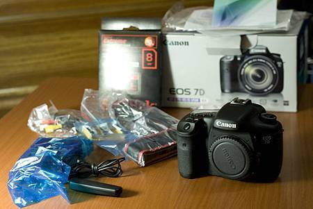 把盒子裡面的東西拿出來囉,快門線、充電器、背帶、傳輸線還有7D機身~