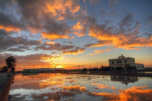 金黃色的雲彩倒映在水田上,相當美麗。